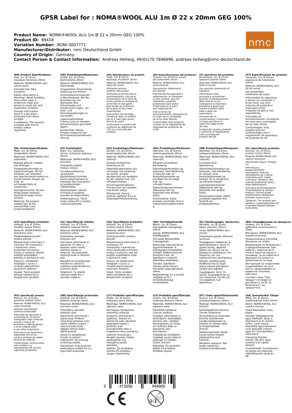 - Rohrisolierung aus Steinwolle – Maße 22 x 20 mm, 1 m lang