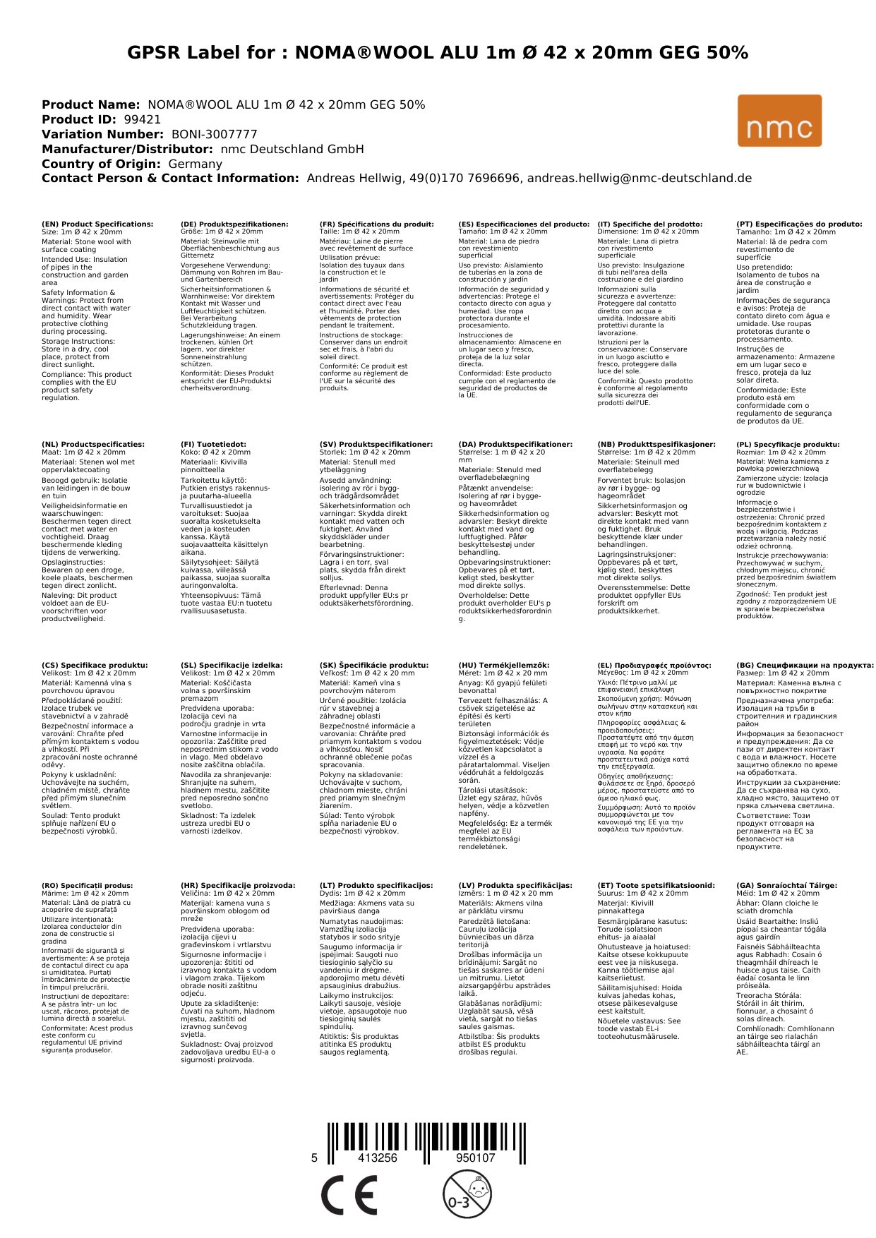 Rohrisolierung, Heizungsrohr Isolierung, Steinwolle, Alu, 42mm, 20mm, 1m