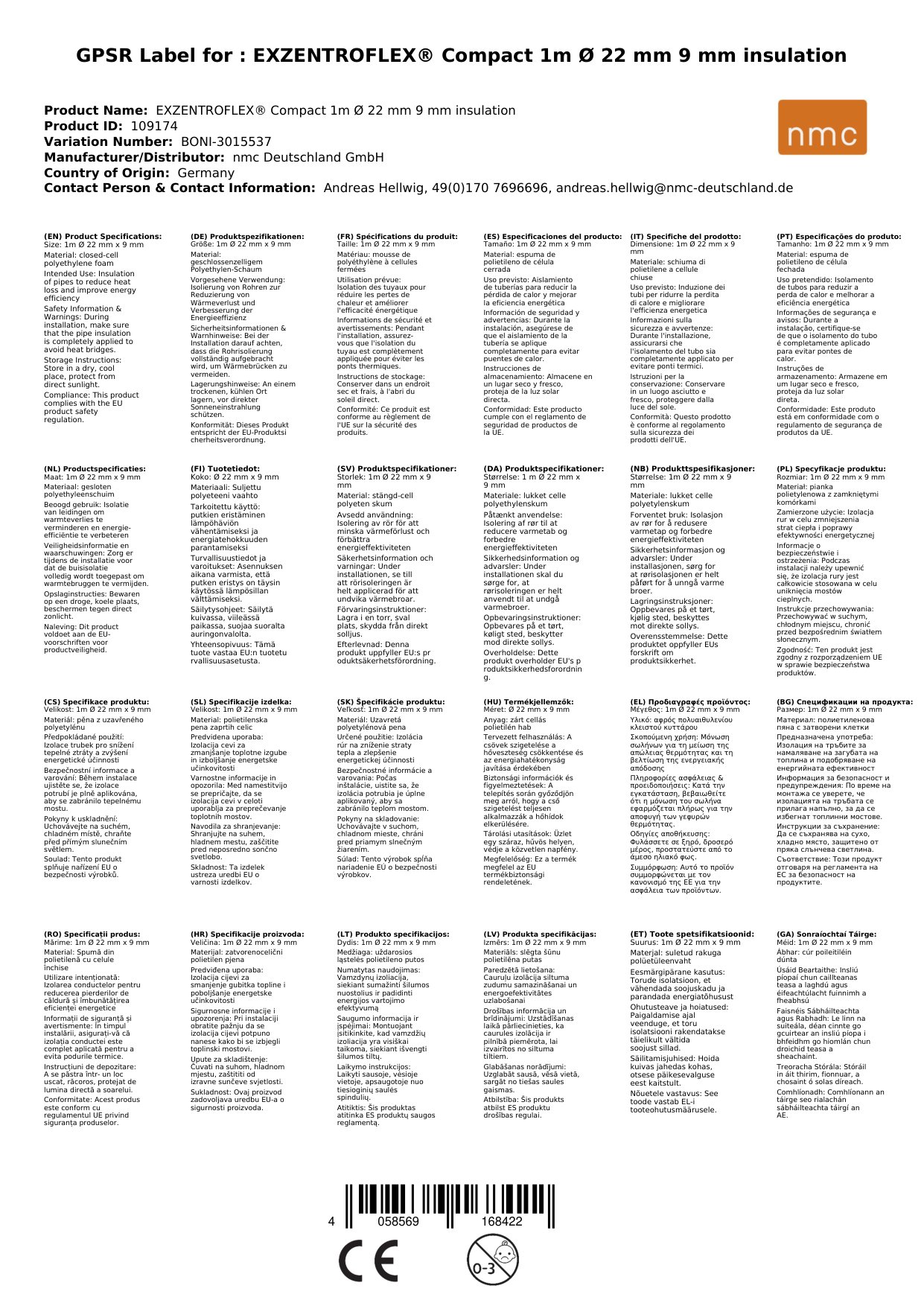 22mm pipe insulation, Compact Pipe Insulation, 1m Ø 22 mm 9 mm Dämmung