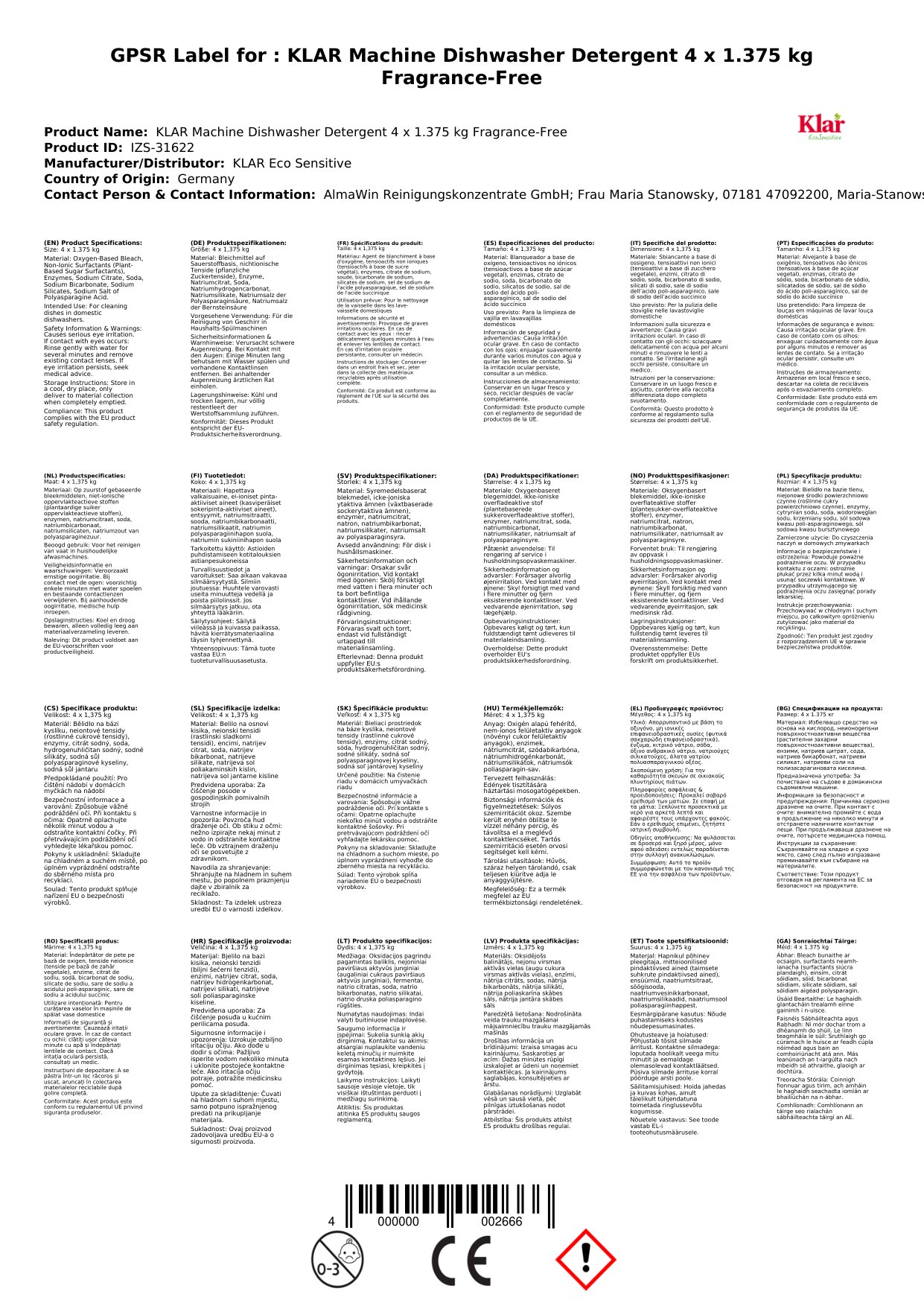 Stellen Sie eine Frage, um mehr über das Produkt zu erfahrenKlar Maschinenspülmittel 4 x 1,375 kg